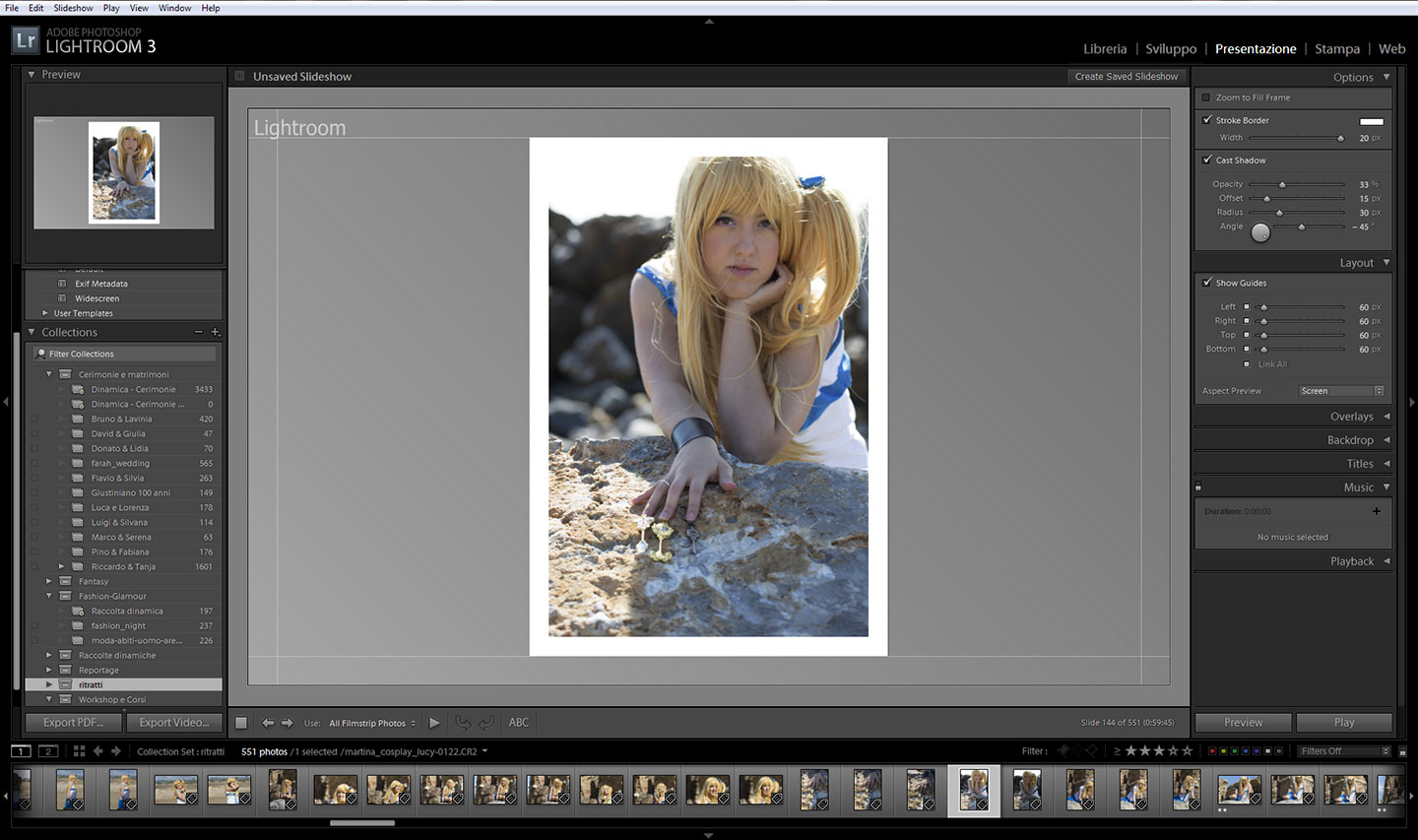 Salto il discorso di importazione delle foto e creazione di una raccolta che esulano dagli scopi di questo tutorial e passo direttamente alla sezione Presentazione di Lightroom, così come potete vedere dalla foto di seguito