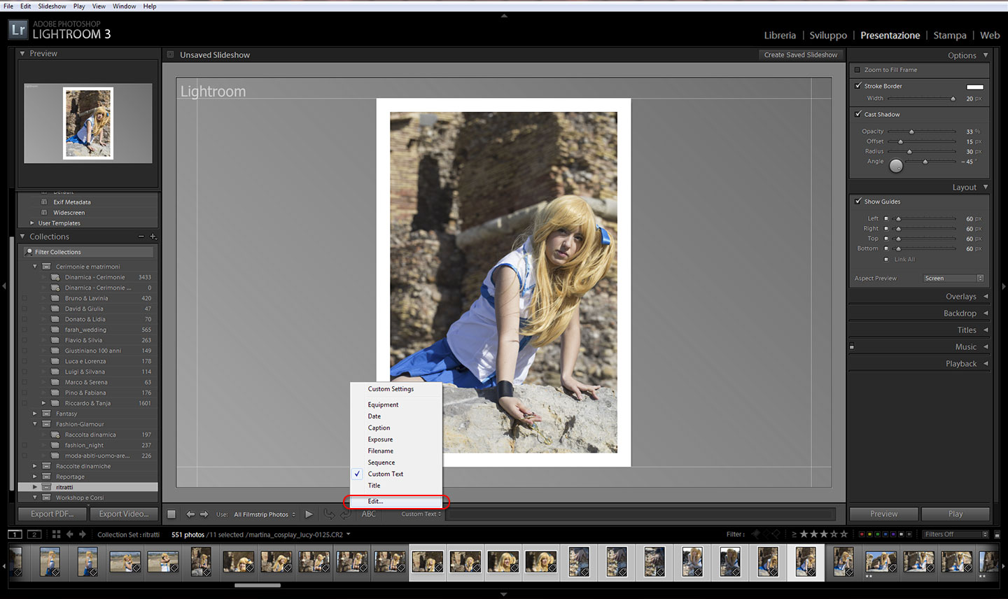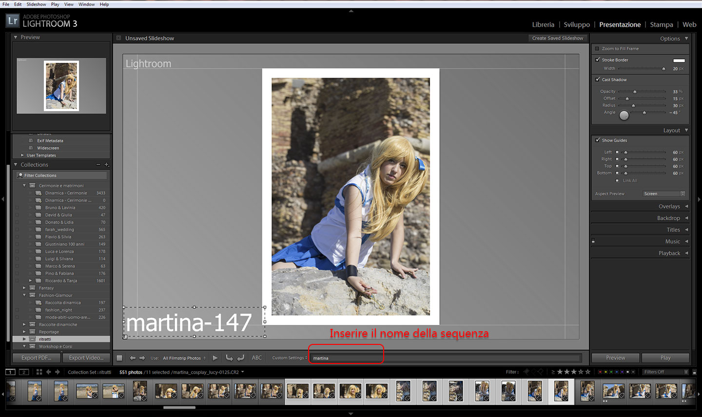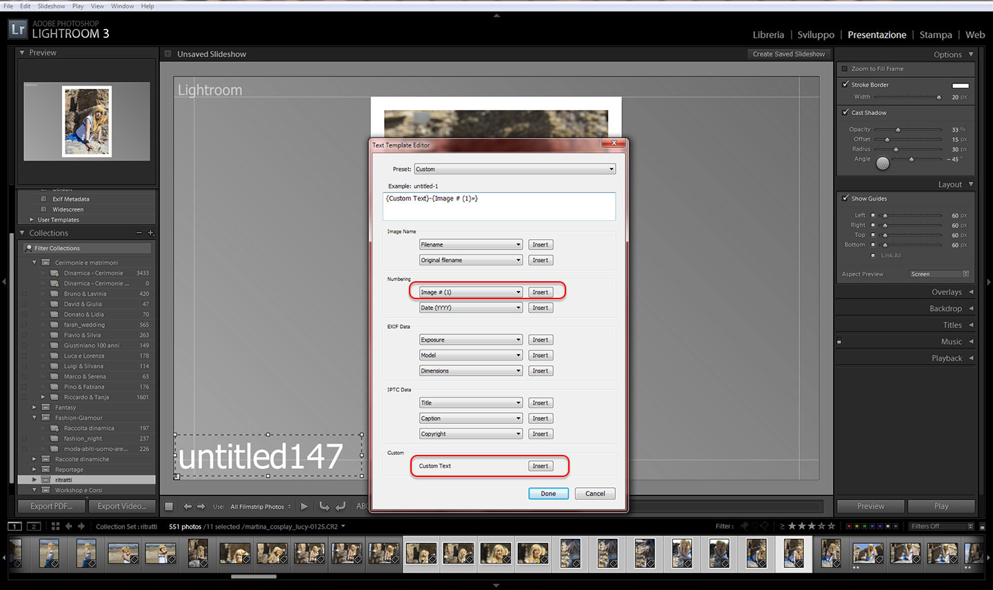 Premetto che questa procedura è valida unicamente per il modulo Presentazione di Lightroom 3.2 e quindi permette l’uso della filigrana con numero progressivo esclusivamente per il salvataggio di file PDF o Video (Mpeg4) che contegono la raccolta che si intende esportare.